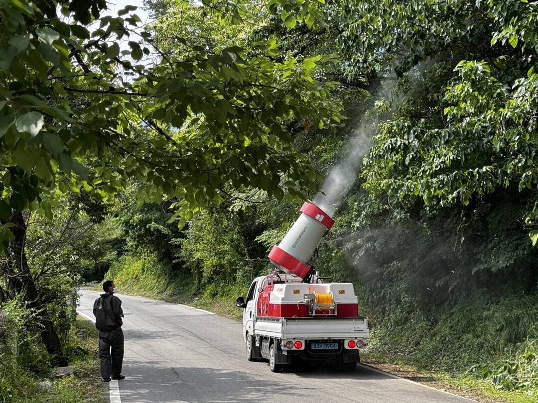 군농업기술센터는 이날 공동방제를 위해 군 산림과와 협업으로 광역살포기와 방제요원 13명을 투입해 백둔리 농경지 269.8ha, 농경지 인접 산림지 200ha 등 총 469.8ha에 공동방제를 실시했다.