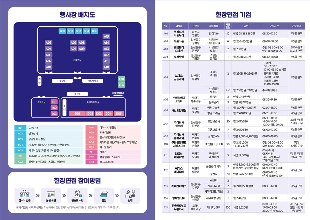 보다 상세한 내용 확인과 현장 면접 사전 신청은 고양시통합일자리정보 누리집 또는 블로그, 전화(☎031-8075-3665)로 하면 된다.