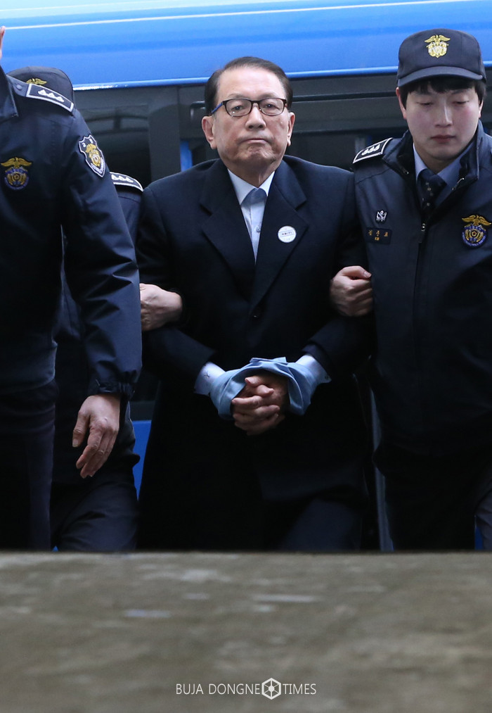 문화계 블랙리스트' 작성을 주도한 혐의로 구속된 김기춘 전 청와대 비서실장이 22일 서울 강남구 대치동 '박근혜 정부의 최순실 등 민간인 국정농단 사건 수사 특별검사팀' 사무실로 소환되고 있다.