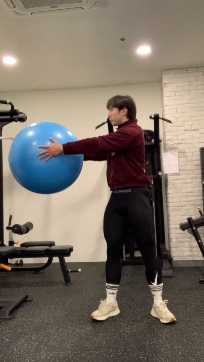 1.짐볼을 들고 앞으로 나란히 한다.