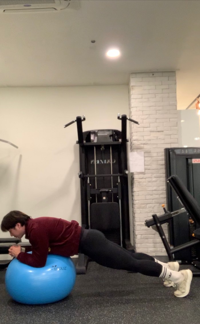 1.짐볼 위에 팔꿈치를 대고 플랭크 동작실시.