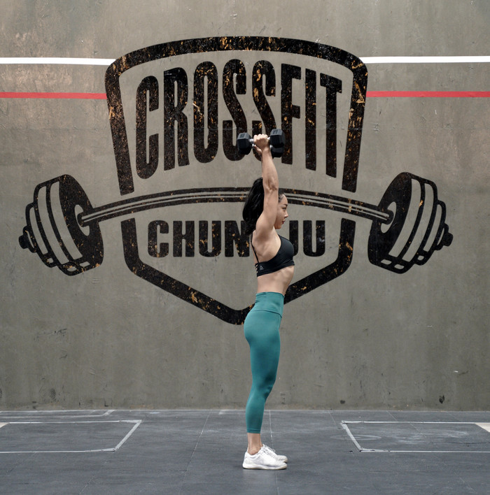 8. 상체를 일으켜 세우며 덤벨을 최대한 몸에 붙여 어깨 위를 스치며 두 팔을 하늘로 곧게 뻗어낸다.