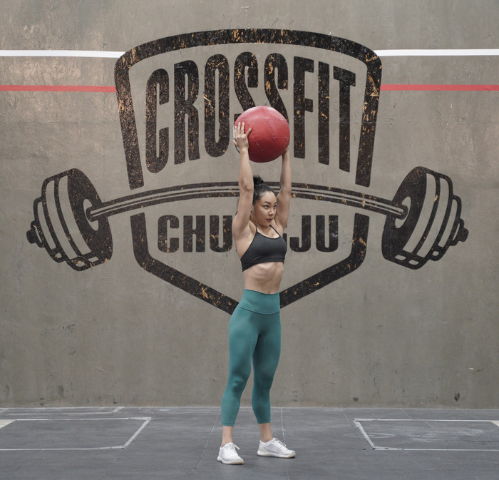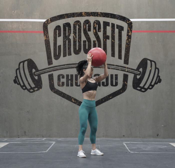 2. 양팔을 곧게 펴며 월볼을 머리위로 올린다. 이때 고관절 및 몸통과 팔꿈치가 모두 펴지도록 한다.