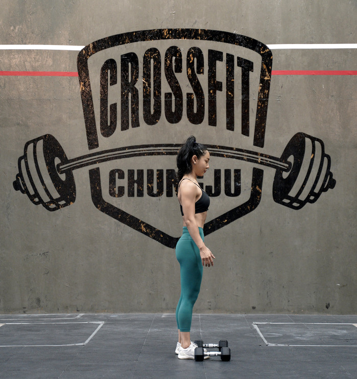 2. 발은 골반 넓이로 벌리고 양손에 덤벨을 쥐고 선다.