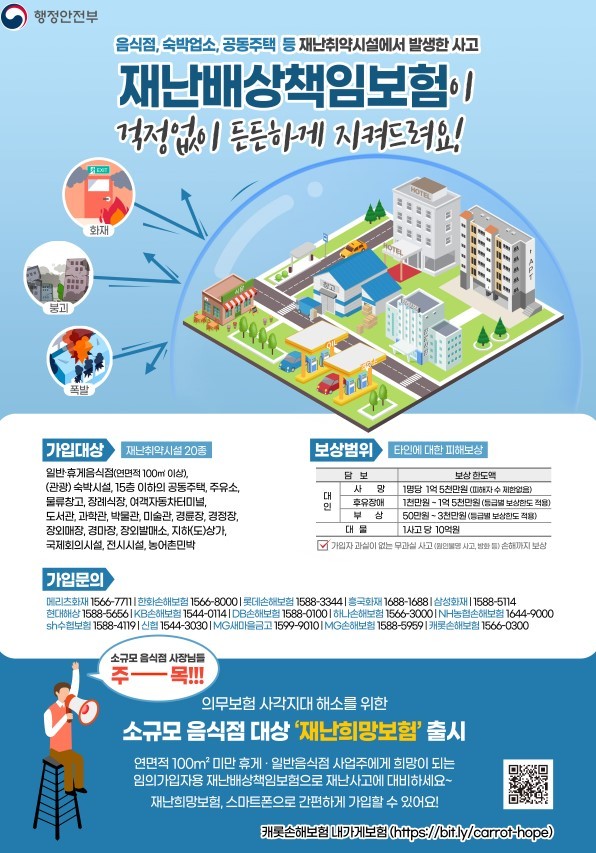 한편, 100㎡ 이하의 소규모 음식점은 전체 음식점 중에서 차지하는 비중이 큰데도 의무가입 대상이 아니어서 보험 사각지대에 있다. 이에 따라 소규모 음식점에 재난배상책임보험 가입을 적극적으로 독려할 방침이다.