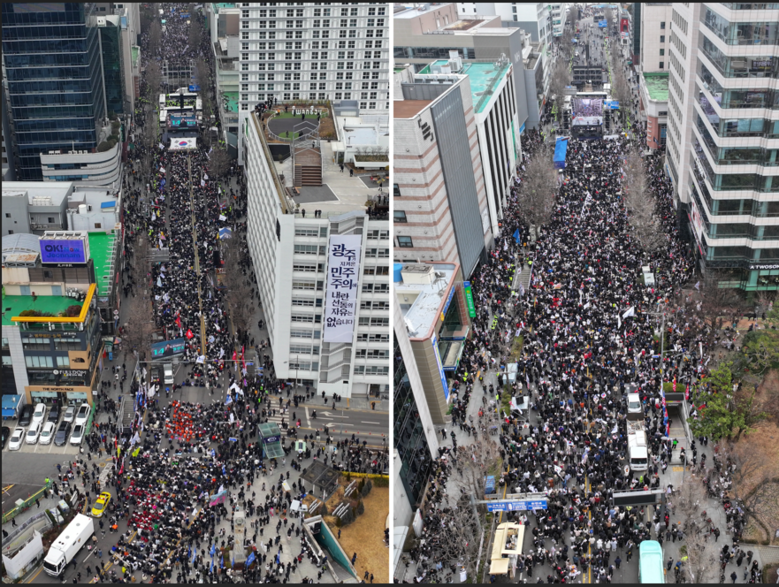 5·18 민주화운동 역사 현장인 광주 동구 금남로에서 15일 윤석열 대통령 탄핵에 찬성, 반대하는 집회가 동시에 열렸다.옛 전남도청 앞 5·18민주광장부터 금남로4가 교차로까지 약 680m 구간 안에서 각각 열린 집회에는 12·3 비상계엄 이후 광주에서 가장 많은 인파가 운집했다.