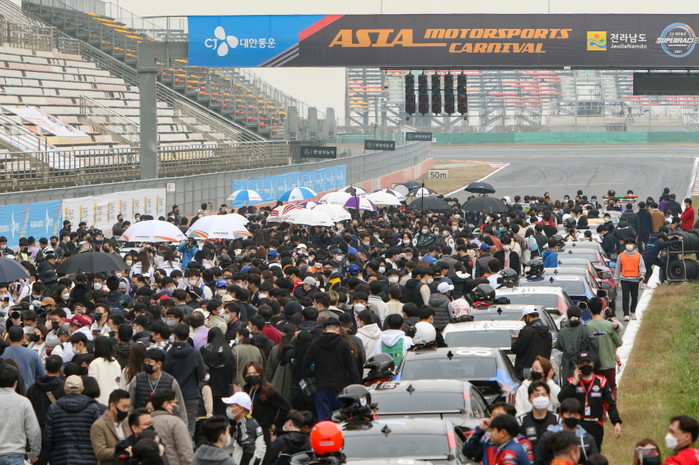 [사진설명] 2021 CJ대한통운 슈퍼레이스 챔피언십 최종전 관객들이 2년 만에 열린 그리드워크 이벤트에 참여하고 있다.