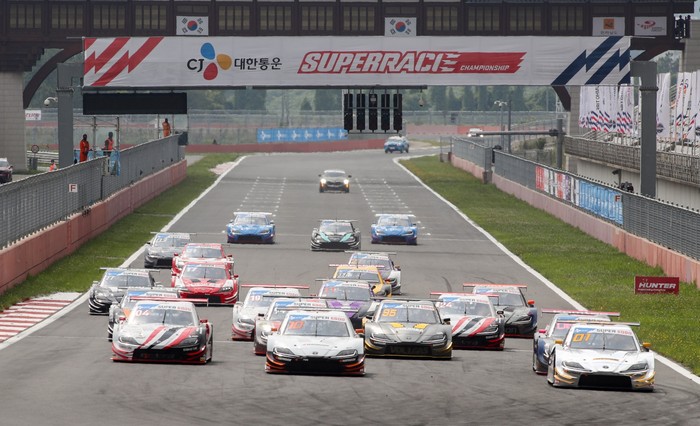 [사진설명] 전남 영암군 코리아인터내셔널서킷에서 20일 열린 2020 CJ대한통운 슈퍼레이스 챔피언십 개막전 슈퍼 6000 클래스 결승전에서 레이싱 머신들이 스타트하고 있다. 이날 경기는 슈퍼레이스 챔피언십 100번째 경기였다.