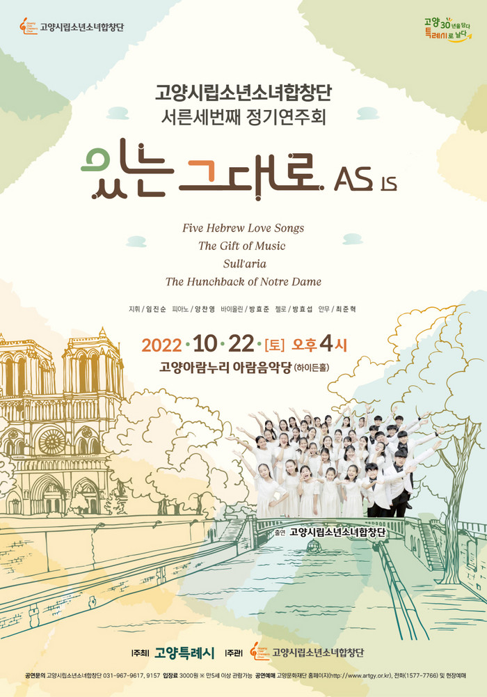 [부자동네타임즈 김인수기자] 가을이 깊어지는 10월, 2003년 창단 이래 고양시를 대표하는 청소년 문화사절단으로 자리 잡은 고양시립소년소녀합창단이 제33회 정기연주회 <있는 그대로 As is>를 오는 10월 22일(토) 오후 4시 아람음악당 하이든 홀에서 개최한다.