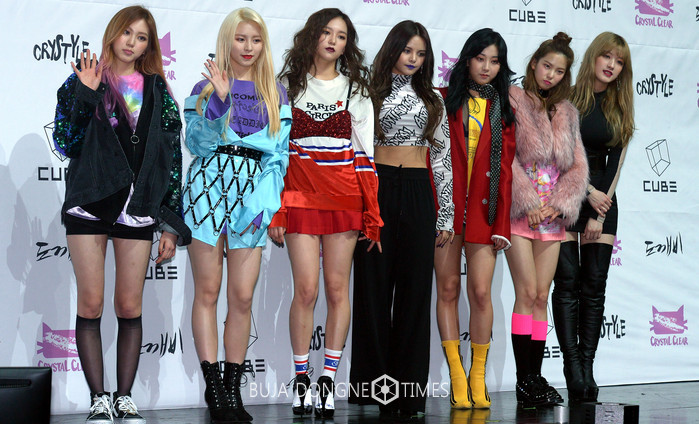 걸그룹 CLC(왼쪽부터 은빈, 엘키, 예은, 손, 승연, 유진, 승희)가 17일 오후 서울 광진구 예스24 라이브홀에서 열린 다섯 번째 미니앨범 '크리스타일(CRYSTYLE)' 쇼케이스에서 포즈를 취하고 있다. 2017.01.17.