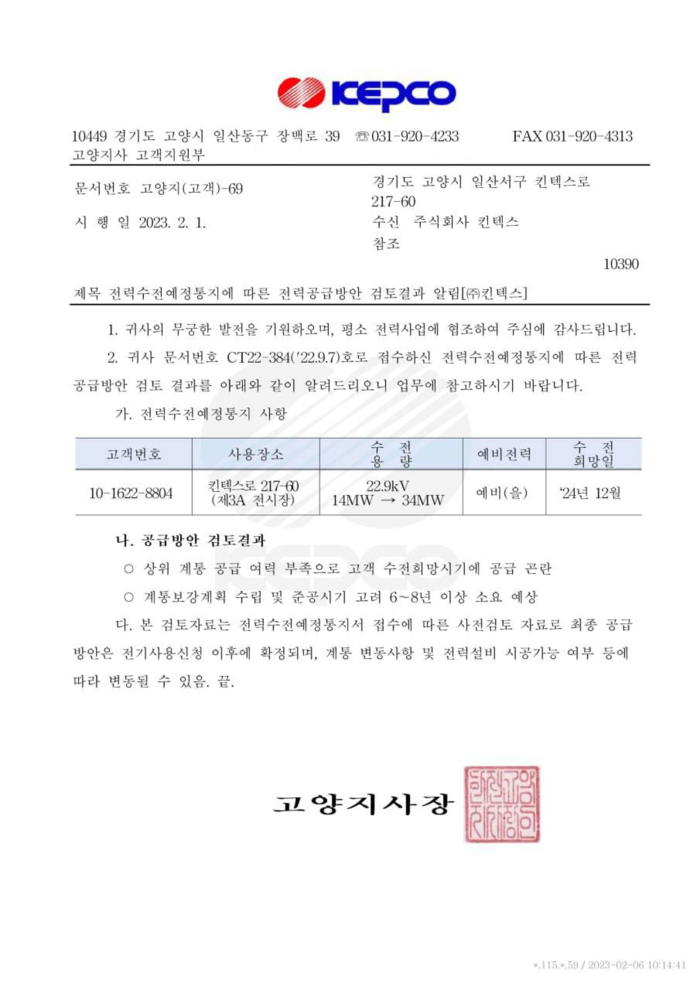 홍정민 의원실에서 확인한 바에 따르면 지난 2월1일 한국전력공사는 킨텍스와 CJ라이브시티에 공문을 보내 킨텍스 제3전시장에서 요청한 20MW, CJ라이브시티 T1부지에서 사용할 11MW 전력의 공급 유예를 통보했다. “상위 계통 공급 여력 부족으로 고객 수전 희망시기에 공급 곤란”하며 “계통보강계획 수립 및 준공시기 고려 6~8년 이상 소요가 예상”되기 때문에 최소 2029년까지 전력공급을 할 수 없다는 내용이다.