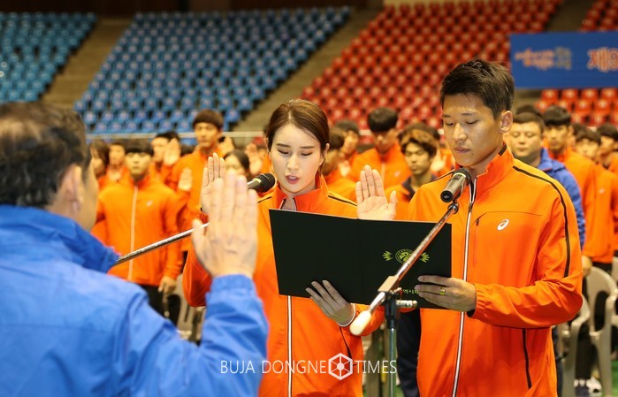 △이번 결단식에서는 양궁 기보배 선수와 육상 김국영 선구가 선수대표로 선서를 진행했다