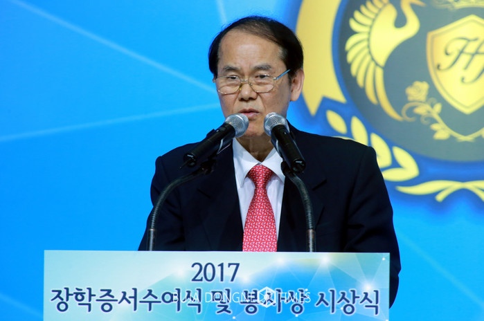 5일 오후 경기도 가평 청심국제청소련수련원 대강당에서 열린 ‘재단법인 효정세계평화재단 2017 장학증서 수여식 및 봉사상 시상식’에서 최영길 (재)한국이슬람교 이사장이 축사를 하고 있다. 이날 행사에는 전체 장학생을 대표하여 한국, 미국, 영국, 독일, 프랑스, 오스트리아, 브라질, 멕시코, 니카라과, 일본, 대만, 네팔, 말레이시아, 호주, 뉴질랜드, 솔로몬 제도, 러시아, 루마니아, 시리아, 이스라엘, 가나, 르완다, 우간다, 잠비아, 카메룬 등 전 세계에서 88개국 800여명의 학생수여자들이 참석했다. 2017.02.05.(사진=재단법인 효정세계평화재단 제공)