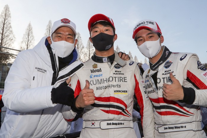[사진설명] 엑스타 레이싱의 김진표 감독, 7라운드 1위를 차지한 노동기, 2위 이정우(왼쪽부터)가 28일 에버랜드 스피드웨이에서 열린 2020 CJ대한통운 슈퍼레이스 챔피언십 7라운드를 마친 뒤 기뻐하고 있다.