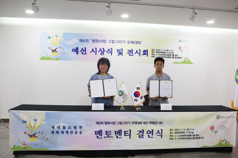 이같이 차세대 인재 양성을 위해 IWPG는 작가들로부터 재능후원을 받아 멘토·멘티 결연식도 진행했다. 이번 예선을 통해 평화 인재로 선발된 장재혁 학생에게는 예선 심사위원이자 공동 전시회에 동참한 심보경 화백의 멘토링 기회가 주어진다.