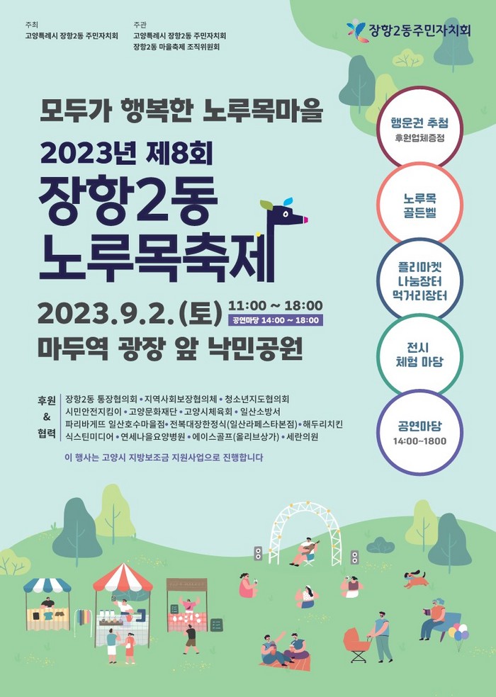 [부자동네타임즈 김인수기자] 고양특례시 장항2동 주민자치회와 노루목축제 조직위원회는 오는 9월 2일(토) 낙민공원에서 ‘2023년 제8회 장항2동 노루목축제’를 개최한다.