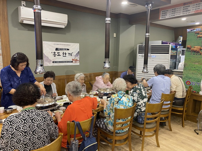 이번 흥도 한 끼 2차 사업은 임가네 한우마을(대표 임경성)에서 진행됐다. 비오는 궂은 날씨 속에서도 어르신 8분이 참석해 맛있는 식사를 즐겼다.