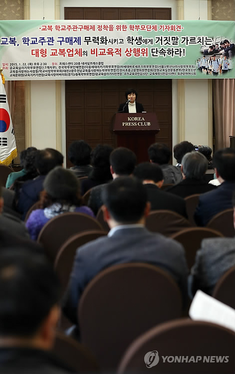 | △ "'교복 학교주관구매제' 방해하는 교복업체 단속하라" (서울=연합뉴스) 신준희 기자 = 22일 오후 서울 중구 프레스센터에서 공교육살리기학부모연합과 전국학부모단체연합이 교복 학교주관구매제 정착을 위한 기자회견을 하고 있다. 이들은 '대형 교복업체들이 비교육적인 상술로 교복 학교주관구매제를 방해하고 있다'며 '교육부가 엄중 단속해야 한다'고 주장했다. 2015.1.22 hama@yna.co.kr |