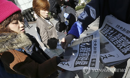 | △ 8일만에 또… (AP=연합뉴스) 1일(현지시간) 일본 도쿄 시민들이 호외로 발행된 '고토(後藤) 씨 살해 영상' 제목의 신문 1면 머리기사를 읽고 있다. 이슬람국가(IS)는 한국시간으로 이날 오전 5시께 일본인 인질 고토 겐지를 살해했음을 보여주는 영상을 인터넷에 올렸다. 지난달 24일 다른 일본인 인질 유카와 하루나를 참수했다고 밝힌 지 8일 만이다. bulls@yna.co.kr |