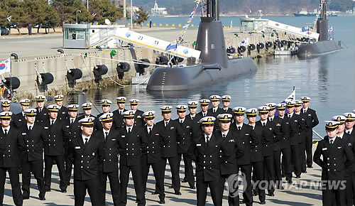 | △ 세계 6번째 잠수함사령부 창설 (창원=연합뉴스) 이정훈 기자 = 2일 경남 진해군항내 잠수함 부두에서 열린 잠수함사령부 창설식에서 장병들이 열중쉬어 자세로 한민구 국방부 장관의 훈시를 듣고 있다. |