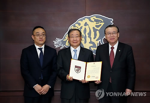 | △ (서울=연합뉴스) 2일 오후 서울 성북구 고려대학교에서 황영(가운데), 황창원(왼쪽)씨가 학교발전기금을 기부한 뒤 김병철 총장과 기념촬영을 하고 있다. 고 황진규씨와 아들 황영씨, 손자 황창원씨까지 3대에 걸친 가족이 고려대에 기부를 해온 것은 이번이 처음이다. 2015.2.2 << 고려대학교 제공> photo@yna.co.kr |