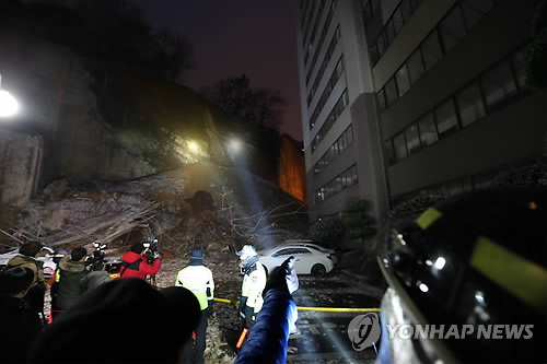 옹벽이 무너지면서 붕괴된 콘크리트와 흘러내린 토사가 바로 아래 주차된 차량 30∼40대를 덮쳤다.