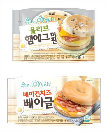 '올리브 햄에그머핀'은 블랙 올리브와 양파가 박힌 수제 잉글리시 머핀을 사용해 만들었다. '베이컨 치즈 베이글'은 양파와 함께 볶은 고소하고 짭짤한 베이컨과 체다치즈를 함께 넣었다. 모두 2천300원.