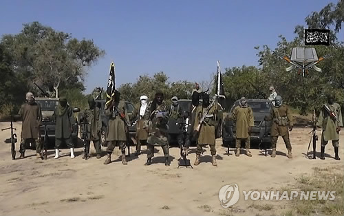 | △ (AP=연합뉴스) 5일(현지시간) 카메룬 당국이 전날 나이지리아의 이슬람 극단주의 무장반군 보코하람이 차드군에 쫓겨 달아나는 도중 카메룬에서 민간인 91명을 살해하고 500명을 다치게 했다고 밝혔다. 사진은 6일 공개된 영상에 나온 보코하람 지도자 아부바카르 셰카우(가운데)모습. |