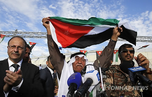 | △ (AP=연합뉴스) 요르단 전투기들이 지난 5일 시리아 내 IS 군사훈련 시설과 무기고공습에 요르단 시민들이 'IS 강경 대응'을 지지하는 구호를 외치고 있는 모습. |