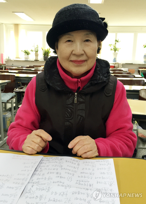| △ 여대생된 75세 장늠이 할머니 (서울=연합뉴스) 정빛나 기자 = 서울 마포구의 학력인정 평생학교인 일성여고 졸업생 장늠이(75)씨가 국가유공자 자녀를 대상으로 한 수시 전형으로 백석예술대 외국어학부에 합격해 다음 달이면 '새내기 여대생'이 된다. 2015.2.9 shine@yna.co.kr |