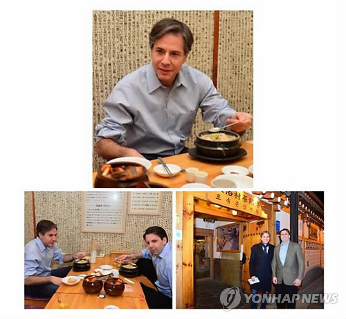 블링큰 부장관과 리퍼트 대사는 8일 오후 서울의 한 삼계탕집에 들러 저녁식사를 했다고 주한미국대사관 등이 트위터를 통해 9일 전했다.