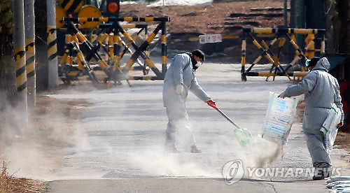 | △ 철원서 구제역 의심 농장 발생…예방 살처분 (철원=연합뉴스) 이상학 기자 = 9일 강원 철원군의 한 돼지농장으로 가는 진입도로에서 방역당국이 생석회를 뿌리고 있다. 강원도는 지난 7일 구제역이 발생한 세종시의 한 농장과 역학 관계에 있는 철원지역 돼지농장 돼지를 살처분하는 등 긴급 방역 조처를 취했다. 2015.2.9 hak@yna.co.kr |