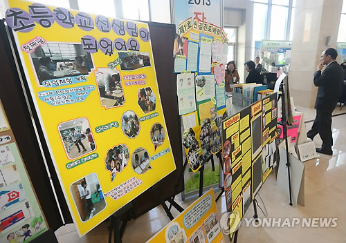 | △ '자유학기제 성과발표회'에서 각 학교 관계자들이 학생들의 활동 작품을 살펴보고 있다. '자유학기제'란 중학교 교육과정 중 한 학기는 학생들이 시험 부담에서 벗어나 꿈과 끼를 찾을 수 있도록 수업 운영을 토론ㆍ 실습 등 학생 참여형으로 개선하고 진로탐색 등 다양한 체험활동이 가능하도록 교육과정을 유연하게 운영하는 제도이다. (연합뉴스 자료사진) |