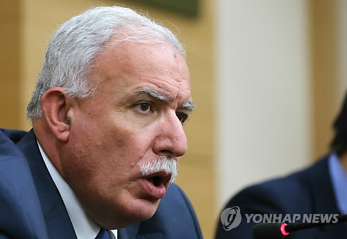 | △ 한-팔레스타인 협력강화 강조하는 말키 장관 (서울=연합뉴스) 황광모 기자 = 한국을 방문중인 리아드 말키 팔레스타인 외교장관이 13일 오후 서울 도렴동 외교부 청사에서 열린 기자간담회에서 한-팔레스타인의 양국의 정책협의회 설치 등 교류 협력 강화를 위한 팔레스타인 정부의 입장을 설명하고 있다. 2015.2.13 hkmpooh@yna.co.kr |