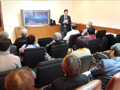 | △ 11일 카자흐스탄 알마티의 고려인회관에서 열린 '고려인 삶' 다큐 상영회에서 김 게르만 고려인협회 부회장이 상영회 취지 등을 고려인에게 소개하고 있다.<카자스스탄 한인일보 제공> |