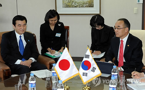 | △ 2012년 11월 24일 오후 정부과천청사에서 열린 한ㆍ일 재무장관회의 모습. 박재완 당시 기획재정부 장관과 조지마 고리키 일본 재무상이 얘기를 나누고 있다. 한일관계 악화 속에 그 이후 한일 재무장관 회담이 열리지 않았다. (연합뉴스.자료사진) |