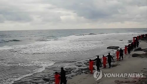| △ (AP=연합뉴스) 이슬람 극단주의 무장세력 '이슬람국가'(IS)가 리비아에서 인질로 잡았던 이집트인 콥트교도 21명을 참수했다고 15일(현지시간) 인터넷에 올린 동영상을 통해 주장했다. 이 영상에서는 IS 대원들이 복면을 한 채 주황색 죄수복을 입은 이집트인 콥트교도 인질들을 한 해변으로 데려가 무릎꿇리고, 이후 바닷물이 피로 물드는 장면과 함께 이들이 참수됐다는 내용이 나온다. 이날 공개된 영상 중 IS 대원들이 복면을 한 채 콥트교도 인질들을 끌고 가는 모습. |