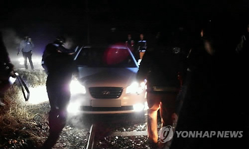 | △ 철길은 기차만 가야죠 (칠곡=연합뉴스) 16일 저녁 경북 칠곡군 지천면 연화리의 경부선 지선 철길에 승용차가 진입한 뒤 바퀴가 빠지는 바람에 빠져나오지 못하자 경찰과 119구조대가 출동해 구조하고 있다. 2015.2.17 << 칠곡소방서 >> sds123@yna.co.kr |