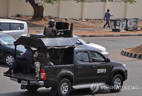 | △ 나이지리아, 보코하람 사태로 대선·총선 연기 (AP=연합뉴스) 나이지리아 선거관리위원회가 북동부 지역을 장악한 이슬람 극단주의 무장반군 보코하람 사태 때문에 오는 14일(현지시간)로 예정됐던 대선 및 총선을 다음달 28일로 연기한다고 발표한 가운데 7일 수도 아부자의 거리를 군인들이 차량을 타고 순찰돌고 있다. marshal@yna.co.kr |