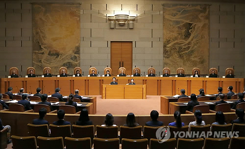 | △ (도쿄 교도=연합뉴스) 일본 최고재판소(대법원에 해당)는 부부가 서로 다른 성(姓)을 쓰는 것을 허용하지 않는 민법 규정과 이혼한 여성이 6개월 내에 재혼하지 못하도록 한 조항의 위헌 여부를 재판관 15명 전원으로 구성된 대법정에서 심사하기로 18일 결정했다. 사진은 2014년 10월 29일 최고재판소 대법정에서 참의원 선거구 사이의 인구 격차 문제가 위헌인지 여부를 심리하는 장면. |