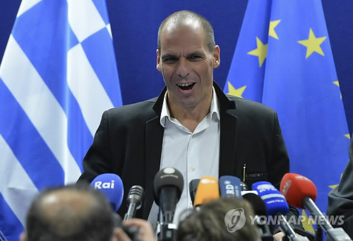| △ 20일(현지시간) 벨기에 브뤼셀에서 야니스 바루파키스 그리스 재무장관이 기자회견을 하고 있다. (EPA=연합뉴스) |