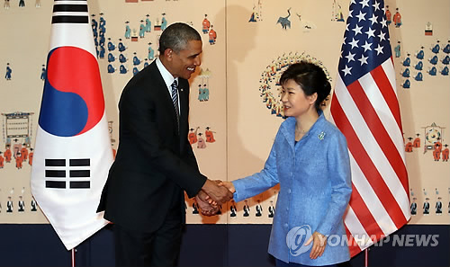 | △ 한미 간에는 지난 2년 간 주요 현안이었던 주한미군 방위비 분담금 협상, 전시작전권 전환시기 재연기 등을 큰 무리 없이 마무리했다. 원자력협정 개정협상도 한미 양국이 명분과 실리를 절충하는 방향으로 곧 최종 타결될 것으로 전망된다. 사진은 지난 2014년 4월 25일 한·미 정상회담에 앞서 박근혜 대통령이 미국 오바마 대통령과 악수하는 모습. (연합뉴스 자료사진) |