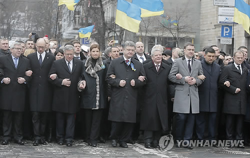 | △ 우크라 정권교체 혁명 1주년 기념 행진 (AP=연합뉴스) 페트로 포로셴코 우크라이나 대통령(가운데)이 22일(현지시간) 정권교체 혁명 1주년을 맞아 수도 키예프 중심가에서 외국 축하 인사들과 함께 기념행진을 하고 있다. marshal@yna.co.kr |