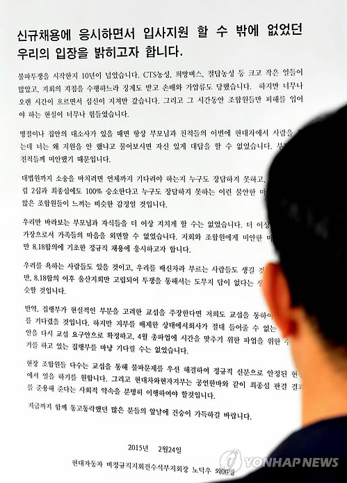 | △ 현대차 울산공장에 붙은 대자보 (울산=연합뉴스) 현대차 울산공장 사내 게시판에 정규직화 투쟁을 접겠다는 비정규직 조합원의 대자보가 24일 게재됐다. 2015.2.24 << 현대차 제공 >> canto@yna.co.kr |