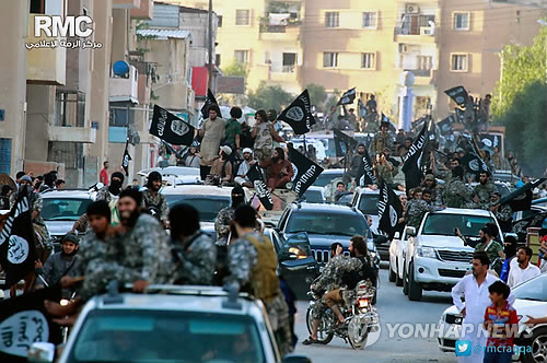 | △ 이슬람 수니파 무장조직 '이슬람국가'(IS)의 대원들이 시리아 북부 락까에서 퍼레이드를 벌이고 있다. 사진은 IS계 락까 미디어센터가 지난해 6월 공개했다. (락까 미디어센터/AP=연합뉴스 자료사진) |