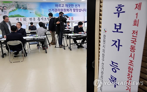 | △ 전국 동시 조합장선거 후보 등록 시작 (창원=연합뉴스) 최병길 기자 = 3월 11일 실시하는 제1회 전국 동시 조합장선거 후보자 등록 첫날인 24일 경남 창원시의창구 선거관리위원회에서 후보자 등록을 하고 있다. 2015.2.24 choi21@yna.co.kr |