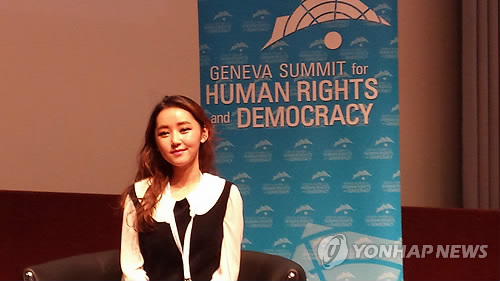 | △ (제네바=연합뉴스) 류현성 특파원 = 탈북 여대생 박연미씨가 24일(현지시간) 스위스 제네바 국제 컨퍼런스 센터에서 열린 `인권과 민주주의를 위한 제네바 정상회의' 한 세션에 참가해 북한의 `장마당 세대'와 자신의 역경 등에 대해 설명하고 있다. 2015.02.25 rhew@yna.co.kr |