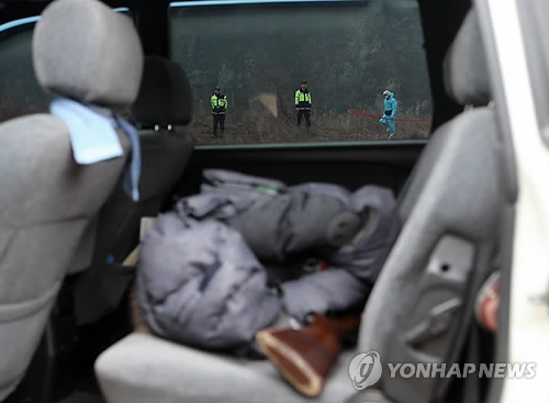 | △ 도주차량 안에서 발견된 총기 (세종=연합뉴스) 양영석 기자 = 25일 세종시에서 50대 남성이 엽총을 쏴서 3명이 숨졌다. 이 남성은 범행 후 차를 타고 도주, 사고 현장과 1km안팎 떨어진 거리에서 스스로 목숨을 끊었다. 도주 차량 너머로 경찰이 일반인의 출입을 통제하고 있다. 2015.2.25 youngs@yna.co.kr |