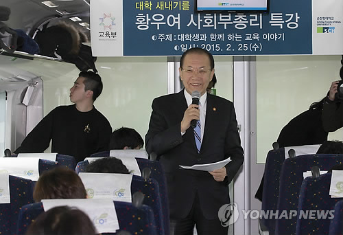 황 부총리는 이날 오전 서울역을 출발해 충남 신창역까지 가는 누리로 열차에서 진행된 순천향대학교 신입생 오리엔테이션의 특강을 통해 대학구조개혁 방식에 대해 "대학 정원을 늘려라 줄여라, 교육부가 요구해서는 안된다"고 말했다.