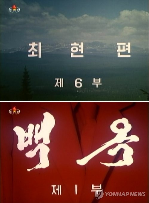 | △ 북한 TV, 최룡해·오일정 부친 띄우기 (서울=연합뉴스) 북한 조선중앙TV는 최근 최룡해 노동당 비서의 부친 최현 전 인민무력부장과 오일정 당 부장의 부친 오진우 전 인민무력부장을 '충신'으로 그린 영화를 잇달아 방영했다. 사진은 최현을 묘사한 영화 '민족과 운명: 최현 편' 6부(지난달 30일 방영, 위쪽)와 오진우에 관한 영화 '백옥' 1부(이달 24일 방영, 아래쪽)의 시작 화면을 캡처한 것. 2014.11.25 nkphoto@yna.co.kr |